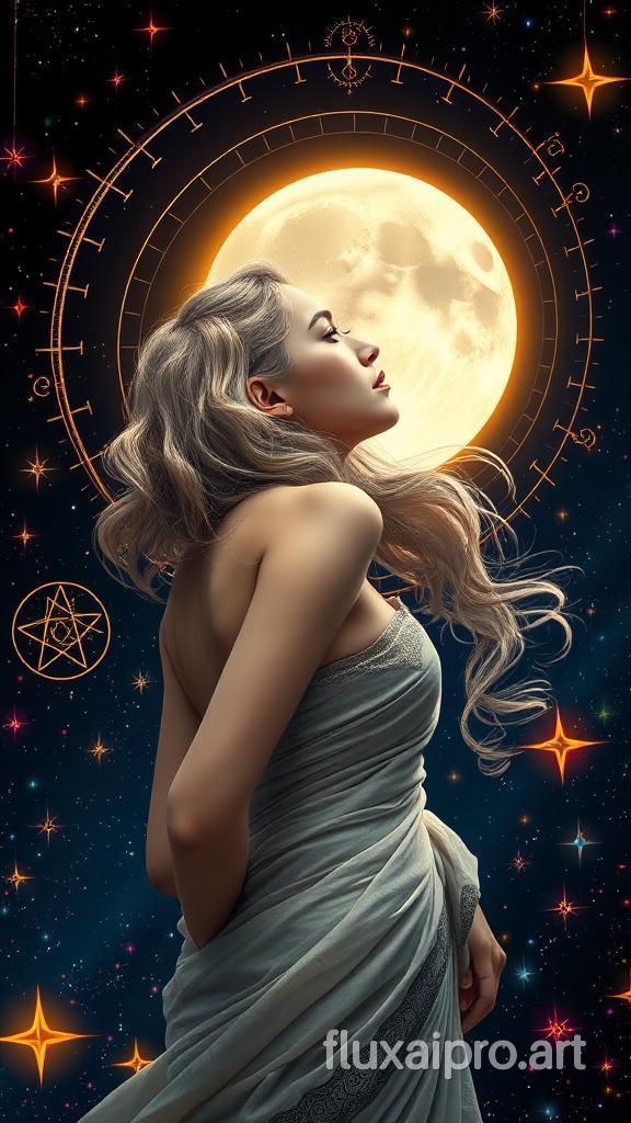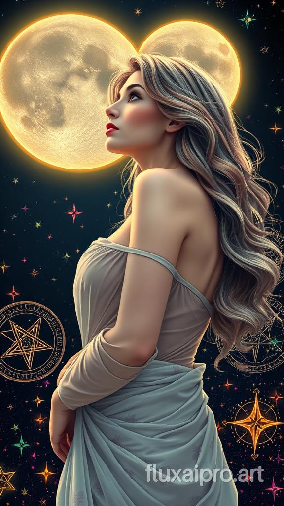 Highly detailed Absolute Realistic breathtaking wallpaper featuring a mature, milky-white-skinned girl with soft, natural makeup and thick, colorful wavy hair flowing gracefully. The portrait captures her upper body from head to thighs, in a side view as she gazes thoughtfully at the sky. Her body is delicately draped in a lightly transparent saree cloth, adding an elegant and sensual touch. The dark sky is illuminated by a shining moon with golden lining, giving it an artistic and ethereal glow. Surround her with intricate, colorful line art of mythical symbols like pentagrams, celestial patterns, and other mystical designs. The background is filled with vibrant, colorful stars, creating a dreamy and magical atmosphere. The overall composition should blend realism with fantasy absolute Realistic , emphasizing both her serene beauty and the mystical surroundings. absolute Realistic scene