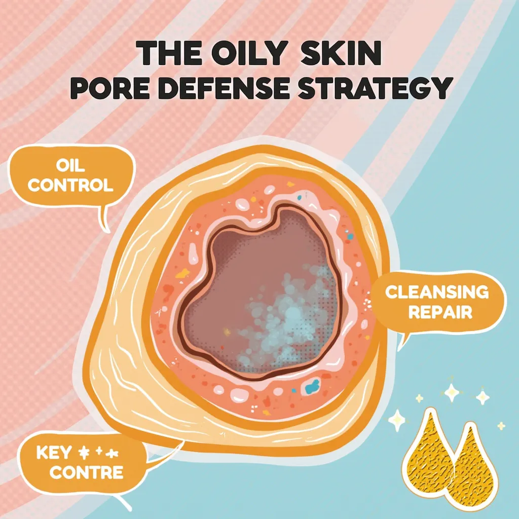 元素:巨型毛孔插画(用橙色线条勾勒)+ 三大关键词气泡「控油|疏通|修护」+ 闪光油滴贴纸