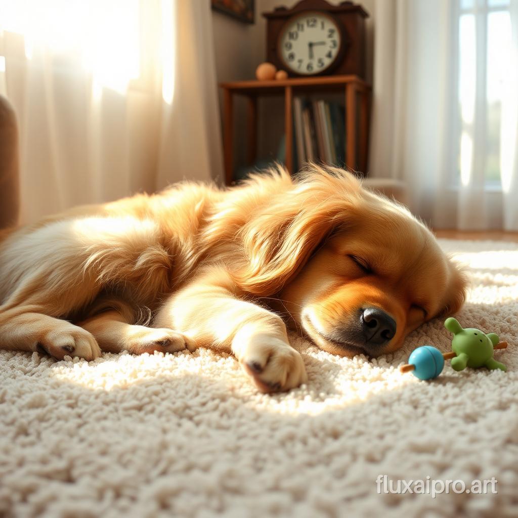 In a cozy corner of a sunlit living room, a fluffy golden retriever lies peacefully asleep on a thick, plush rug. Soft rays of sunlight filter through the sheer curtains, creating warm patches of light that dance on its fur. The dog's chest rises and falls rhythmically, a gentle reminder of its tranquil slumber. Its eyelids flutter occasionally, as if dreaming of chasing after butterflies in a meadow. Surrounding the dog are a few scattered toys, their faded colors brightening the scene with playful nostalgia. The air is filled with a comforting warmth, and the faint sound of a ticking clock adds to the serene atmosphere, enhancing the feeling of safety and contentment in this serene moment.
