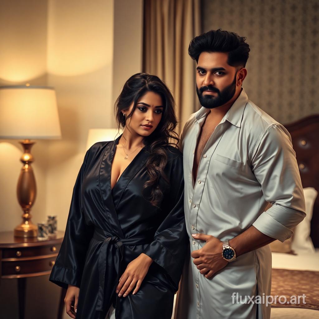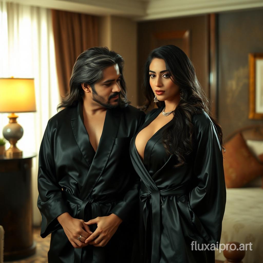 create an image of Kajal Raghwani in a  black satin robe with shafqat cheema in a hotel room in action movie.  he is enticed by her beauty.