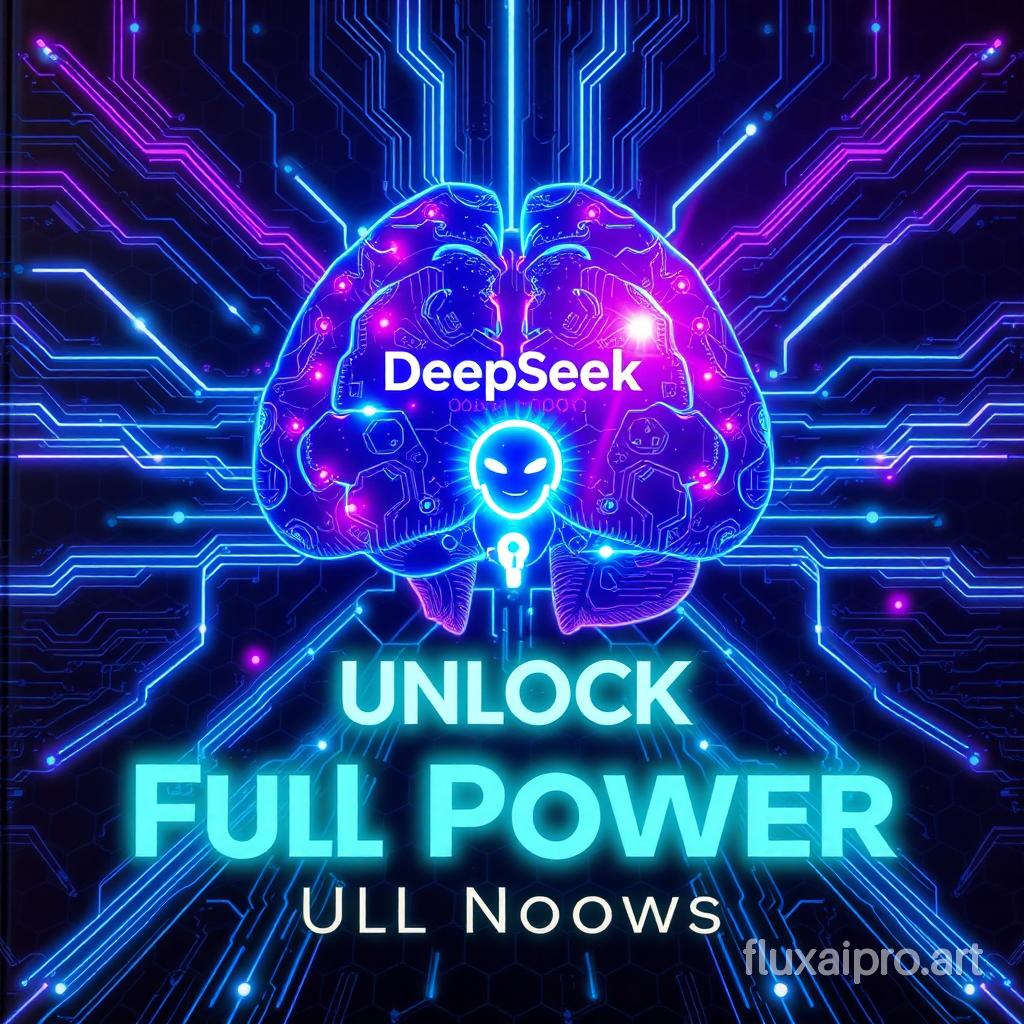 A hyper-detailed futuristic tech cover, glowing blue and purple neon circuits forming the shape of a digital brain, vibrant energy beams bursting from the center where a glowing 'DeepSeek-R1' logo floats, holographic code streams flowing around a floating AI assistant robot holding a key, dynamic speed lines and particle effects emphasizing 'unlocked' power, dark gradient background with hexagonal tech grids, modern minimal typography 'Unlock Full Power' in glowing cyan with circuit texture, ultra realistic 8K render, cyberpunk aesthetic with metallic reflections, cinematic lighting --ar 16:9